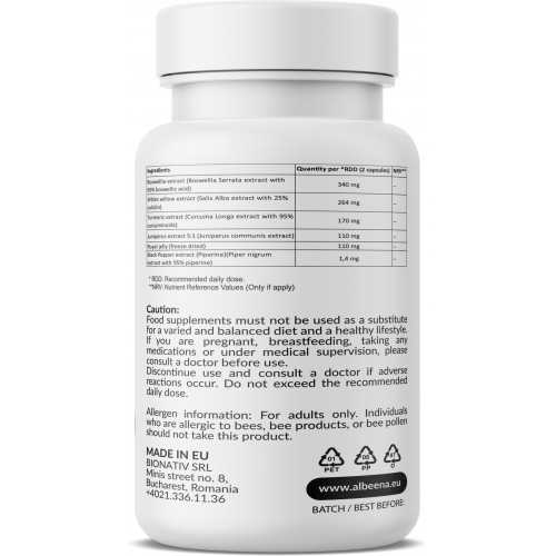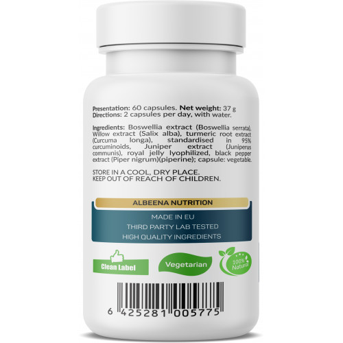 Složení: extrakt z kadidlové pryskyřice (Boswellia serrata) s 65 % boswellových kyselin, extrakt z vrbové kůry (Salix alba) s 25 % salicinu, extrakt z kořene kurkumy (Curcuma longa) standardizovaný na 95 % celkových kurkuminoidů, ovocný extrakt z jalovce (Juniperus communis), lyofilizovaná mateří kašička, Bioperine - extrakt z plodů černého pepře (Piper nigrum) s 95 % piperinu; kapsle: rostlinná.