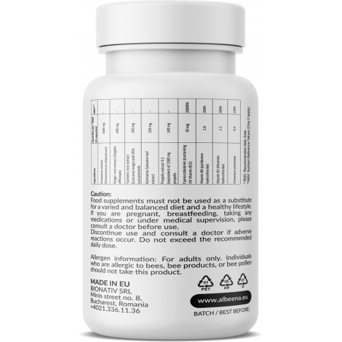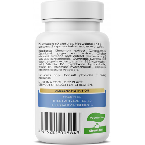 Extrakt ze skořice (Cinnamomum Zeylanicum), extrakt z kořene zázvoru (Zingiber officinale), extrakt z kořene kurkumy (Curcuma longa) s 95 % kurkuminoidů, extrakt z listů Gymnema Sylvestre, extrakt z propolisu, vitamín B12 (kyanokobalamin), vitamín B6 (pyridoxin hydrochlorid), vitamín B1 (thiamin hydrochlorid), pikolinát chromitý; kapsle: rostlinná.